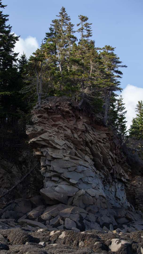 Then we turned left out toward the Bay of Fundy where you get to a nice little beach area, then onto a trail that leads toward Grindstone Island and over the high cliffs, a trail not for the faint of heart. Travelling above the cliffs in the picture below, your holding onto trees as you pass very close to the edge. We were heading to an area of the shoreline to see some old tidal caves that had collapsed years ago.