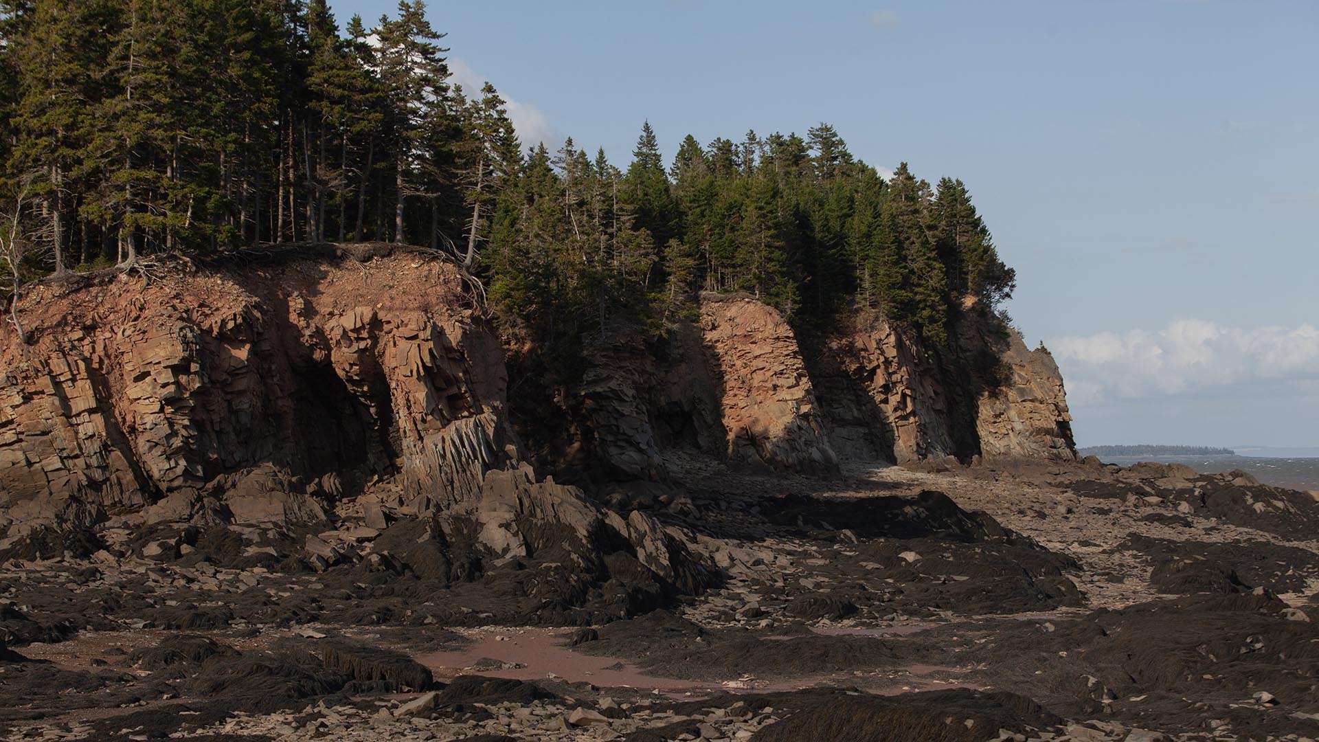 Then we turned left out toward the Bay of Fundy where you get to a nice little beach area, then onto a trail that leads toward Grindstone Island and over the high cliffs, a trail not for the faint of heart. Travelling above the cliffs in the picture below, your holding onto trees as you pass very close to the edge. We were heading to an area of the shoreline to see some old tidal caves that had collapsed years ago.